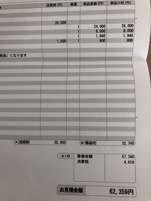 フロントガラス見積(ステップワゴン) その他 2019年02月16日 0 先日、ファミリーカーのステップワゴンのフロントガラスにヒビが入った ショックを胸に、ホンダと民間工場へ持っていき、見積もりをしてもらいました。 ホンダでは ガラス代、部品代、技術料含めて ¥133,879 電話で聞いた時は、18万円はするという感じだったので、少し安い額になってました。 ホンダで見積した後、近くの民間工場 ロータスアサヒさんへ 小さくてキレイとは言えない事務所へ通され、見積は夕方にメールで送ってもらうことに。 工場の人も、事務員さんも感じの良い人でした。 夕方送ってもらった見積もりがコチラ なんとホンダの半額以下の ¥62,359 ガラスは純正ではなく、海外製でとくに問題はないとのこと。 純正だとガラスだけで8万円ほどするらしい。 一応、検討しますという返答をしつつ、心ではロータスアサヒさんにお願いしようと決めました。 PR