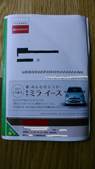 新型ミライース お店に見に行ってきました!! トピックス 2017年05月15日 0 先日、ディーラーから新型ミライースのDMが届きました。 2017.5.9発売だそうです。 一度、現物が見たかったので、週末ディーラーへ見に行ってきました。 ついでに、今乗っている2014年式のミライースの下取りを出してもらうと、 40万円とのことでした~ 走行距離が3年ちょっとで13,000キロ程度でこれくらいの下取りなんですね。 数枚、写真を撮ってきましたので、ご紹介します。 カッコ良かったので、これは売れそうだなと思いました。 白いナンバープレートは、ラグビーワールドカップ記念のチャリティプレートだそうです。 普通車と同じような扱いをされそうで、料金所で困るかもしれませんね。 とくにドレスアップ車は、カッコ良いですね~ PR
