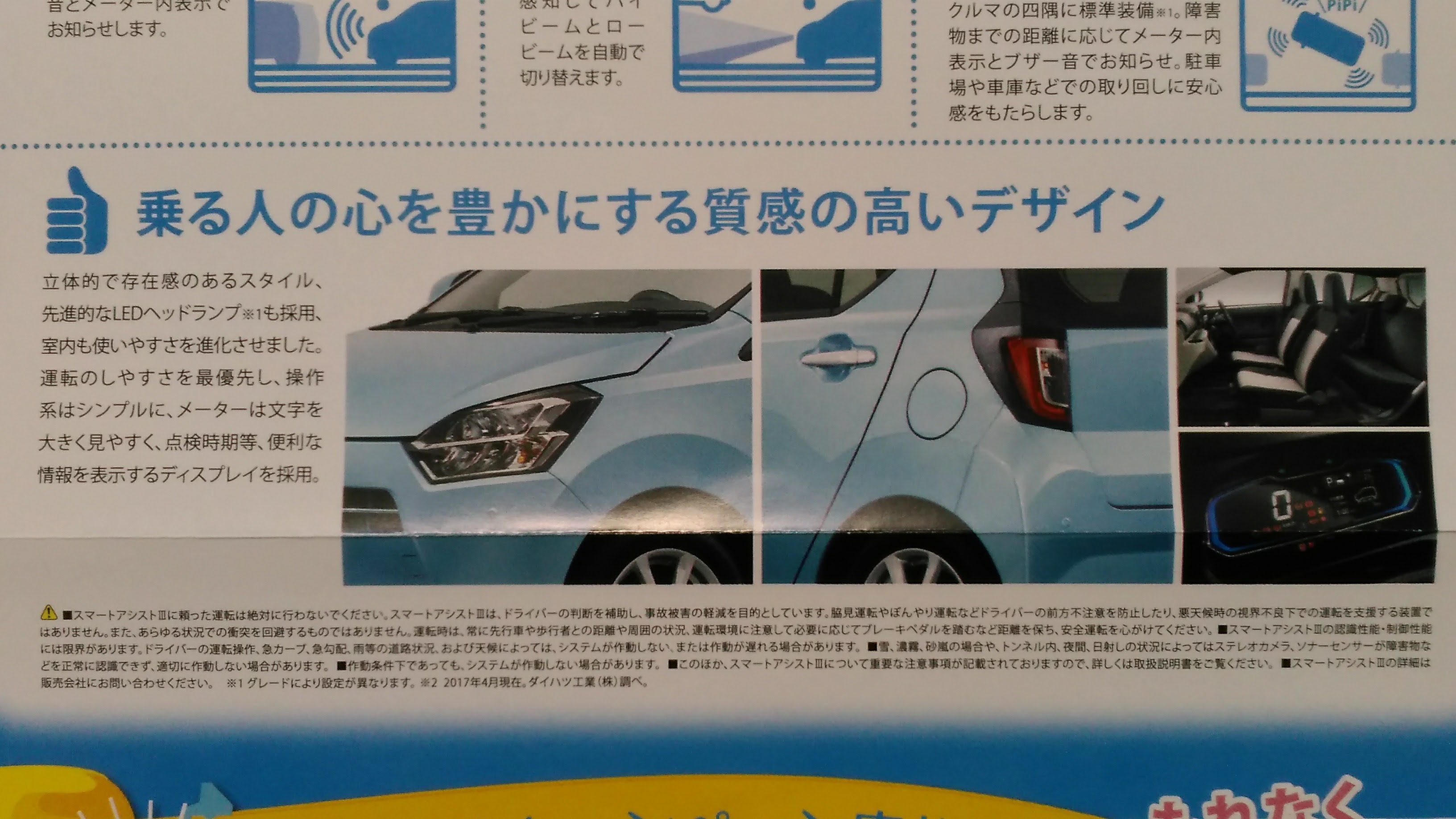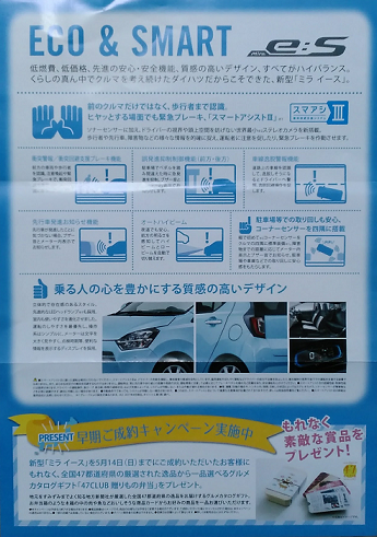 新型ミライース 案内のDMが届いた!!2017年6月発売? トピックス 2017年04月07日 0 今日、仕事から帰宅すると、ダイハツからDMが届いていました。 いつも来る販売の案内かと思いきや、中をよく見ると 新型「ミライース」の発売をいち早くご案内いたします。 というパンフレットが入っていました。 裏面には そして、すべてではないですが、新型ミライースのデザイン写真も DMにはこのあたりまでの情報しかありませんでした。 具体的な発売時期は、載されていませんでしたが、 パンフレットの下部に ~早期ご成約キャンペーン実施中~ という見出しで、5/14(日)までにご成約いただいたお客様に もれなく、全国47都道府県の源泉された逸品から一品選べる グルメカタログギフトをプレゼント。 と記載がありました。 5/14までが早期成約ということは、発売は6月頃なんでしょうか。。。 いつになるのでしょうね。。。 PR