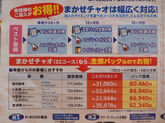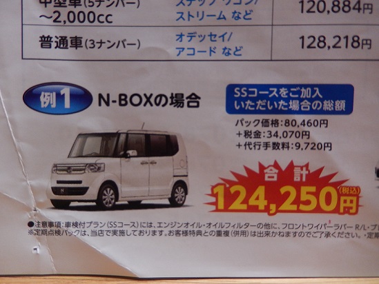 ミライース 初めての車検を前に② 車検費用 2016年12月10日 0 先日、ダイハツディーラーで、ざっくりとした車検費用を教えてもらいましたが、 高いのか安いのか、よく分かりませんでした。 他のところでは、どれくらいの費用が掛かるのか気になるところです。 ちょうど、我が家のホンダステップワゴンの12か月点検の時期でしたので、 ホンダディーラーで、ミライースの車検ができるのか? できるならいくらかかるのか聞いてみることにしました。 車検自体は、他メーカーの車でも問題なくできるとのこと。 アイドリングストップ車なので、メーカーが違うと整備など問題があるのかなと不安でしたが、 ホンダ車にもアイドリングストップ車もありますし、構造自体さほど違うものでもないとのこと。 そのあたりは心配ないようでした。 で、車検費用とその後の点検パックがいくらくらいなのか、チラシをもとに内容を聞いてみると・・・ このチラシの一番上の段が軽自動車で、パック価格 ¥80,460円 おお!!ダイハツディーラーの ¥83,538 よりも安い!! と思いきや ¥80,460円には、法定費用が含まれていない価格だったので、 法定費用34,070円 代行手数料9,720円 を足すと 合計 ¥124,250円 ダイハツより高い値段やないか~い。 とうことで、ダイハツディーラーの方が4万円も安いことが分かりました~ チラシが汚くてゴメンナサイ・・・ PR